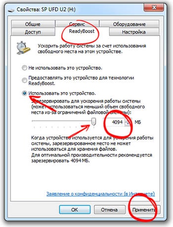 2. В появившемся окне выбираем вкладку Ready Boost и ставим галочку
