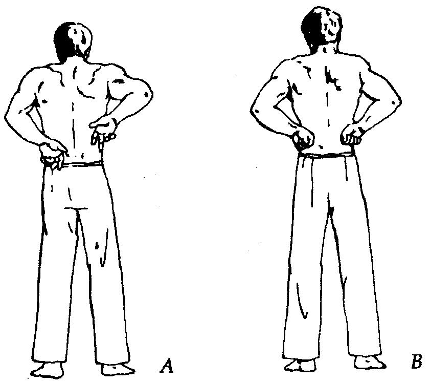 Выполнение: Примите Стойку Всадника, полностью расслабьтесь. Поднимите руку за спиной на уровень почек и начните быстро растирать поясницу в области почек вверх-вниз тыльными сторонами ладоней. Продолжайте до тех пор, пока не ощутите тепло в почках (обычно это происходит через две или три минуты). Это хороший способ разогреть все тело холодным зимним утром. После растирания можно также слегка похлопать по почкам тыльными сторонами ладоней, левой и правой попеременно. Не хлопайте слишком сильно, чтобы не вызвать неприятных ощущений; а если ваши почки больны или слишком чувствительны, то лучше вообще отказаться от похлопывания до тех пор, пока их состояние не улучшится.