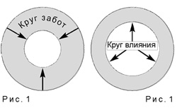 Из этих схем видно, что если мы не смещаем акцент с внешнего круга забот на внутренний круг влияния, то внешний мир, который и так достаточно сильно давит, может просто задушить внутренне слабого человека, лишенного духовной поддержки (рис.1). Так сужается наш круг влияния. Это судьба людей, живущих по принципу "снаружи - внутрь", т.е ожидающих милости от внешнего мира. С другой стороны, если мы внутренне растем, наш круг влияния расширяется, и мы больше способны воздействовать на окружающую среду (рис. 2). Так действует духовная концепция "изнутри - наружу". Оковы материи раздвигаются духовной силой, как тьма устраняется светом.
